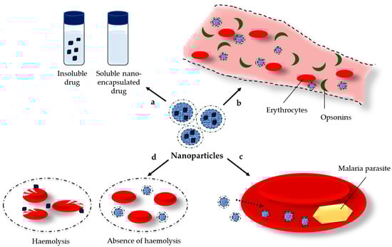 Nanotechnology is a powerful strategy capable of solving some of the issues of current antimalarial drugs. The nanoparticles could improve the solubility of poorly soluble drugs by different mechanisms like amorphization, micellar solubilization, etc., (Figure 3a). The surface modification of nanoparticles, especially by attachment of polyethylene glycols, avoids opsonization and provides long circulation in the bloodstream that further enables the interaction of antimalarial drugs with the infected erythrocytes (Figure 3b). Nanoparticles could ensure drug delivery exclusively in the infected host cells, minimizing its systemic toxic effects, and could ameliorate patient adherence to the therapy (Figure 3c). In addition, the high intra-erythrocytic concentration of the drugs could overcome the problem with the resistance of the parasites. Last but not least, the nanoparticles provide sustained release of the loaded drugs that could reduce the hemolytic effect of some of the antimalarial drugs (e.g., artemisinin, quinine, etc.) (Figure 3d). The nanoparticles can be formulated with a variety of available carriers, e.g., polymers, lipids, etc., or directly prepared by green synthesis from plant extracts []. Some of the most-researched types of nanoparticles for malaria treatment are schematically presented in Figure 4. In addition, it is important to point out that some of the carriers could exert a positive effect in animal malaria models themselves [,,].