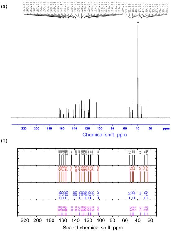 Experimental NMR spectrum (a) and scaled calculated chemical shifts (b) for the 1st (black), 2nd (red), 3rd (blue), and 4th (purple) conformers on 13C nuclei. The asterisk symbol denotes the residual signal from 13C in non-deuterated solvent molecules (39.5 ppm).