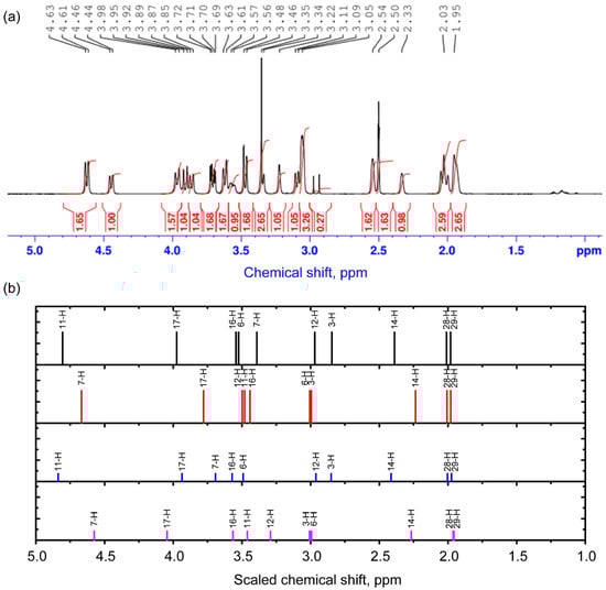 Experimental 1H NMR spectrum in the range of 1–5 ppm (a) and scaled calculated chemical shifts (b) for the 1st (black), 2nd (red), 3rd (blue), and 4th (purple) conformers for protons. The signal from 1H in non-deuterated solvent molecules is present at 2.5 ppm.