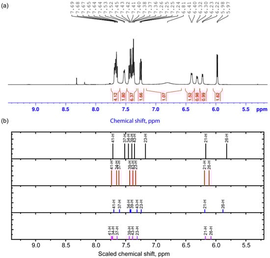 Experimental 1H NMR spectrum in the range 5.2–9.4 ppm (a) and scaled calculated chemical shifts (b) for the 1st (black), 2nd (red), 3rd (blue), and 4th (purple) conformers for protons in this range.