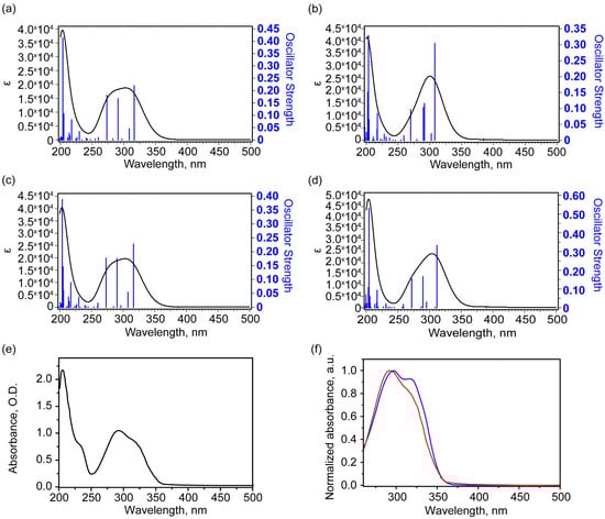 Theoretical electronic UV-Vis absorbance spectra of conformers in ethanol solutions: 1 (a), 3 (b), 2 (c), 4 (d), and experimental UV-Vis absorbance spectrum (e) and normalized absorbance spectra of ethanol solution (red) and DMSO solution with subtracted solvent contribution (blue) (f). In (f), the region was reduced due to the strong absorbance of DMSO solvent.