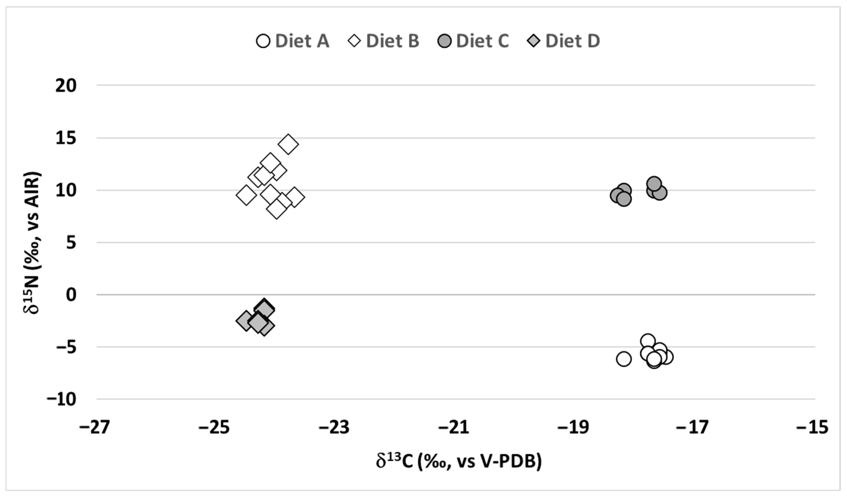 Diet D | 20 g/L of D-(+) Glucose 2 (δ13C = −23.7‰) | 2.5 g/L of potassium nitrate (δ15N = 1.3‰) |