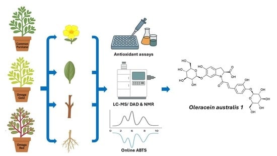 - Cannavacciuolo, C.; Napolitano, A.; Dirsch, V.M.; Heiss, E.H.; Masullo, M.; Piacente, S. Oleraceins from Portulaca oleracea Leaves: Quali-Quantitative Determination and Antioxidant Potential. Curr. Res. Food Sci. 2025, 10, 100992. [Google Scholar] [CrossRef]