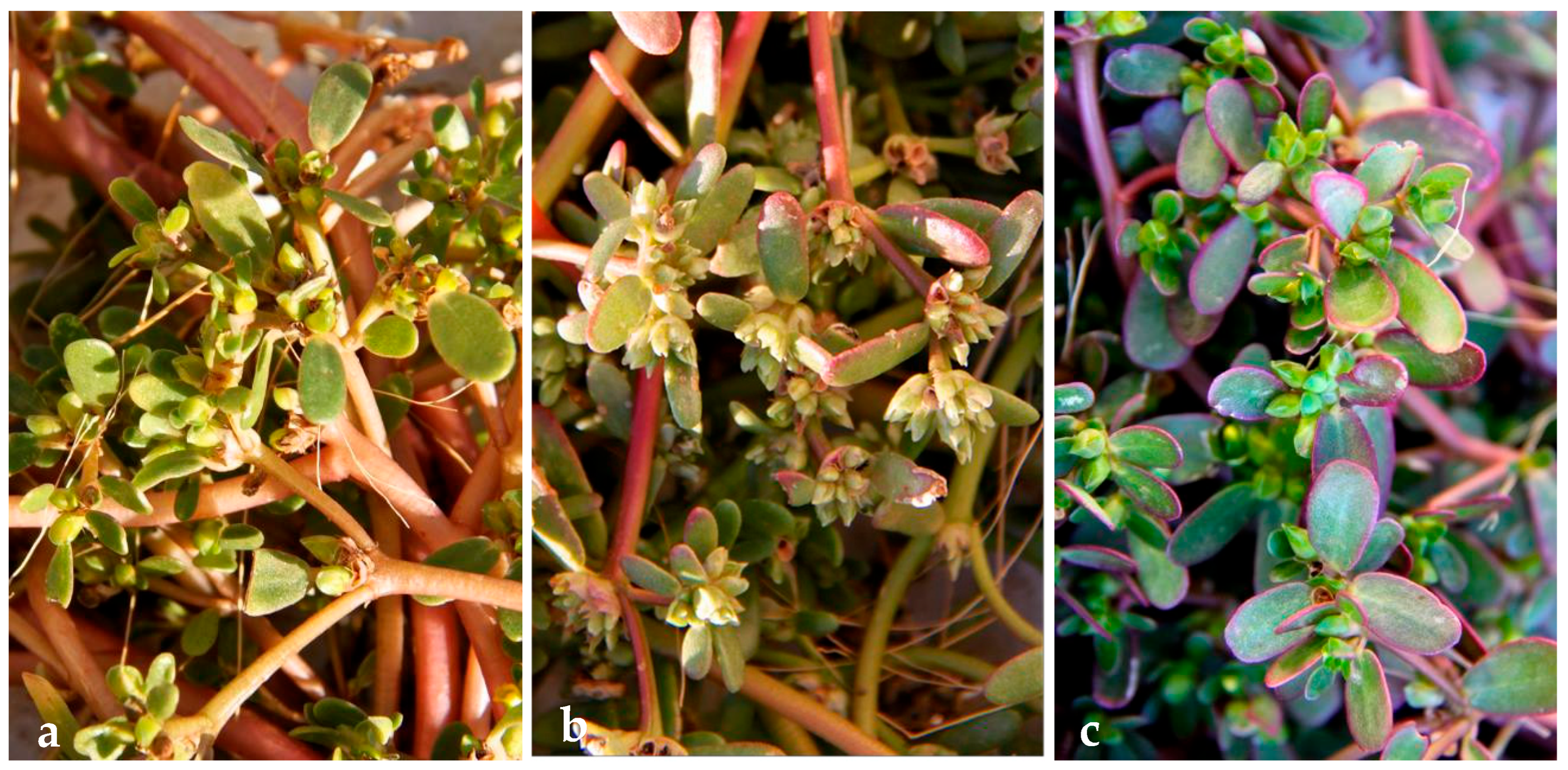- Petropoulos, S.; Karkanis, A.; Martins, N.; Ferreira, I. Phytochemical Composition and Bioactive Compounds of Common Purslane (Portulaca oleracea L.) as Affected by Crop Management Practices. Trends Food Sci. Technol. 2016, 55, 1–10. [Google Scholar] [CrossRef]
