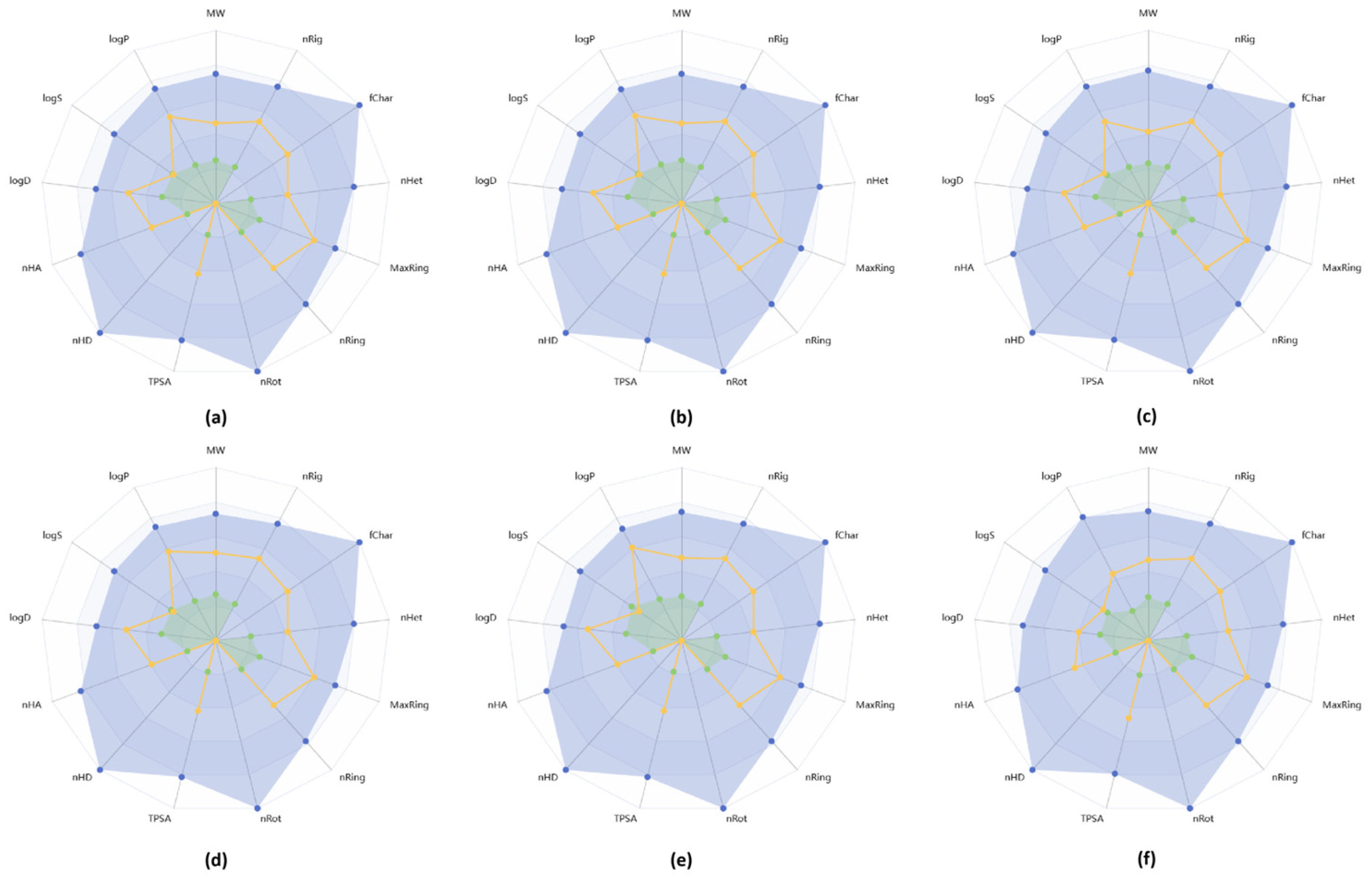 - Fu, L.; Shi, S.; Yi, J.; Wang, N.; He, Y.; Wu, Z.; Peng, J.; Deng, Y.; Wang, W.; Wu, C.; et al. ADMETlab 3.0: An updated comprehensive online ADMET prediction platform enhanced with broader coverage, improved performance, API functionality and decision support. Nucleic Acids Res. 2024, 52, W422–W431. [Google Scholar] [CrossRef]
