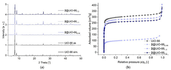 (a) PXRD of UiO-66, 2@UiO-660.44 (post-synthetic encapsulated) and the in situ encapsulated 2@UiO-661.1 and 2@UiO-667.2 composites. Simulated diffractogram of UiO-66 from CCDC No. 752051 [64]. (b) Nitrogen adsorption isotherms at 77 K of neat UiO-66 (1192 m2/g), 2@UiO-661.1 (1115 m2/g), 2@UiO-667.2 (916 m2/g), and 2@UiO-660.44 (381 m2/g). For the desorption isotherms, see Figures S11 and S12 in Supplementary Materials.