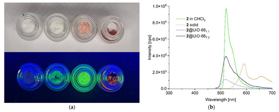 The 2@UiO-66 composites exhibit emission maxima at 521 nm ± 2 nm and are thus all comparable to 2 in solution (8 mmol/L), which shows its emission maximum at 523 nm. Figure 3b illustrates the emission intensities of the lowest and highest in situ loaded 2@UiO-66 composites together with 2 in CHCl3 (8 mmol/L) and 2 as a solid (for the emission spectra of all UiO-66 composites, see Figure S25). The observed broadening of the emission band of the composites shown in Figure 3b can be attributed to the heterogeneous and rigid environment of the MOF matrix. As already described, the Bodipy molecules in solution are uniformly solvated by CHCl3, which allows free rotational and translational motion. As a result, all molecules emit with nearly identical energies and produce a narrow emission band. In contrast, the confinement within the MOF restricts molecular mobility and exposes the Bodipy molecules to different microenvironments depending on their orientation within the pore. This leads to different emission energies and slight shifts in the emission maxima of individual molecules. In addition, intermolecular interactions such as aggregation further disrupt the energies in the excited state. The cumulative effect of all these changes leads to an experimentally observed broadening of the entire emission band. The intensity of this band increases with higher Bodipy loading, yet without any bathochromic shift being observed for higher concentrations in CHCl3 solutions of 2 (cf. Figure 1c). However, the emission maximum of 521 nm is already as seen for the higher-concentrated Bodipy CHCl3 solution of 8 mmol/L, which can be attributed to the suppression of the rotation of 2 within the MOF pore [66,67].