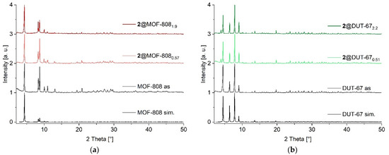 (a) PXRD of MOF-808, post-synthetic 2@MOF-8080.57 and in situ encapsulated 2@MOF-8081.9 composites. Simulated diffractogram of MOF-808 from CCDC No. 1002672 [73]. (b) PXRD of DUT-67, post-synthetic 2@DUT-670.51, and in situ encapsulated 2@DUT-672.2 composites. Simulated diffractogram of DUT-67 from CCDC No. 921644 [74]. For the PXRDs of MIP-206 and 2@MIP-2060.3, see Figure S20a.