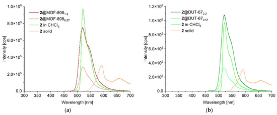 Steady-state luminescence measurements showed that both the post-synthetically loaded and in situ fabricated composites of MOF-808 and DUT-67 exhibit the characteristic luminescence of 2 in solution with emission maxima in the region of 521 nm ± 2 nm, with a shoulder at 550 nm (Figure 6). The observed broadening of the emission bands of the 2@MOF-808 and 2@DUT-67 composites shown in Figure 6 can be explained by the different microenvironments, as for the 2@UiO-66 composites. Due to the higher loading in the composites produced in situ, a significant increase in luminescence intensity can be measured (for MIP-206 see Supplementary Materials, Section S10). We expect only a primary inner filter effect, just as for the 2@UiO-66 composites, as the 2@MOF-808 and 2@DUT-67 composites are in the same concentration range. Again, as for 2@UiO-66, the shoulder around 550 nm indicates multiple occupancy of some pores and thus the formation of aggregates between two or more Bodipy molecules in the same pore. The probability p of a multiple pore occupation of 2 in both MOFs is listed in Table 5, taking into account that the pores are formed with the molecular formula units of [Zr6O4(OH)10(BTC)2(H2O)6] for MOF-808 and [Zr6O4(OH)8(TDC)4(H2O)6] for DUT-67 (for a more detailed description of the structures and the ratios of pore-to-molecular formula units, see Supplementary Materials Section S7).