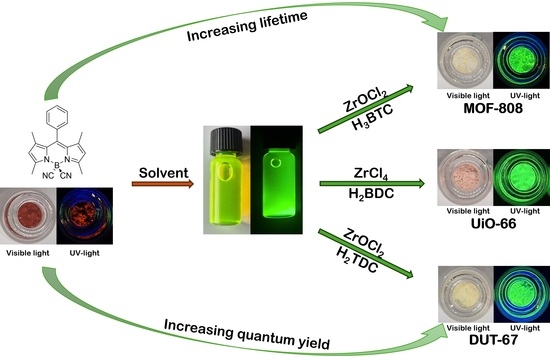 Chicago/Turabian StyleFetzer, Marcus N. A., Maximilian Vieten, Aysenur Limon, and Christoph Janiak. 2025. "Encapsulation of a Highly Acid-Stable Dicyano-Bodipy in Zr-Based Metal–Organic Frameworks with Increased Fluorescence Lifetime and Quantum Yield Within the Solid Solution Concept" Molecules 30, no. 21: 4151. https://doi.org/10.3390/molecules30214151