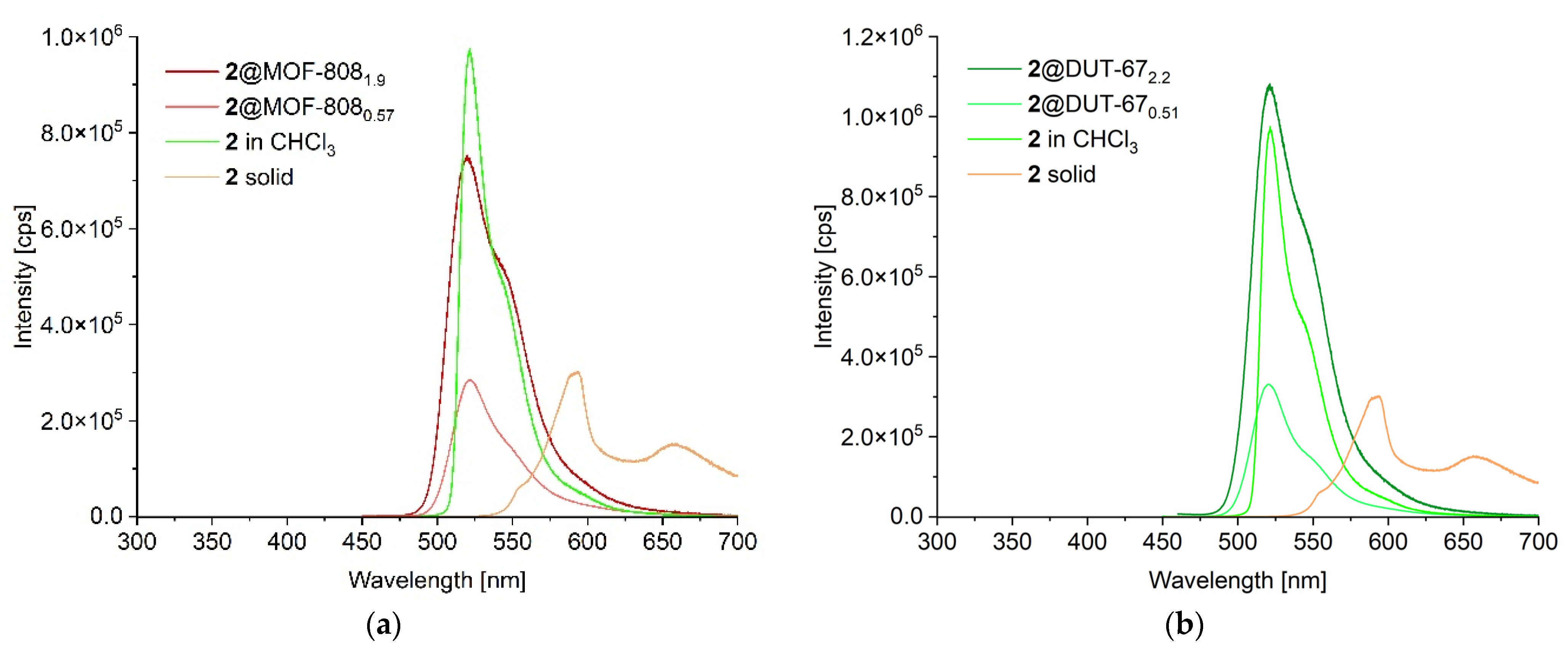 - Glembockyte, V.; Frenette, M.; Mottillo, C.; Durantini, A.M.; Gostick, J.; Strukil, V.; Friscic, T.; Cosa, G. Highly Photostable and Fluorescent Microporous Solids Prepared via Solid-State Entrapment of Boron Dipyrromethene Dyes in a Nascent Metal-Organic Framework. J. Am. Chem. Soc. 2018, 140, 16882–16887. [Google Scholar] [CrossRef]