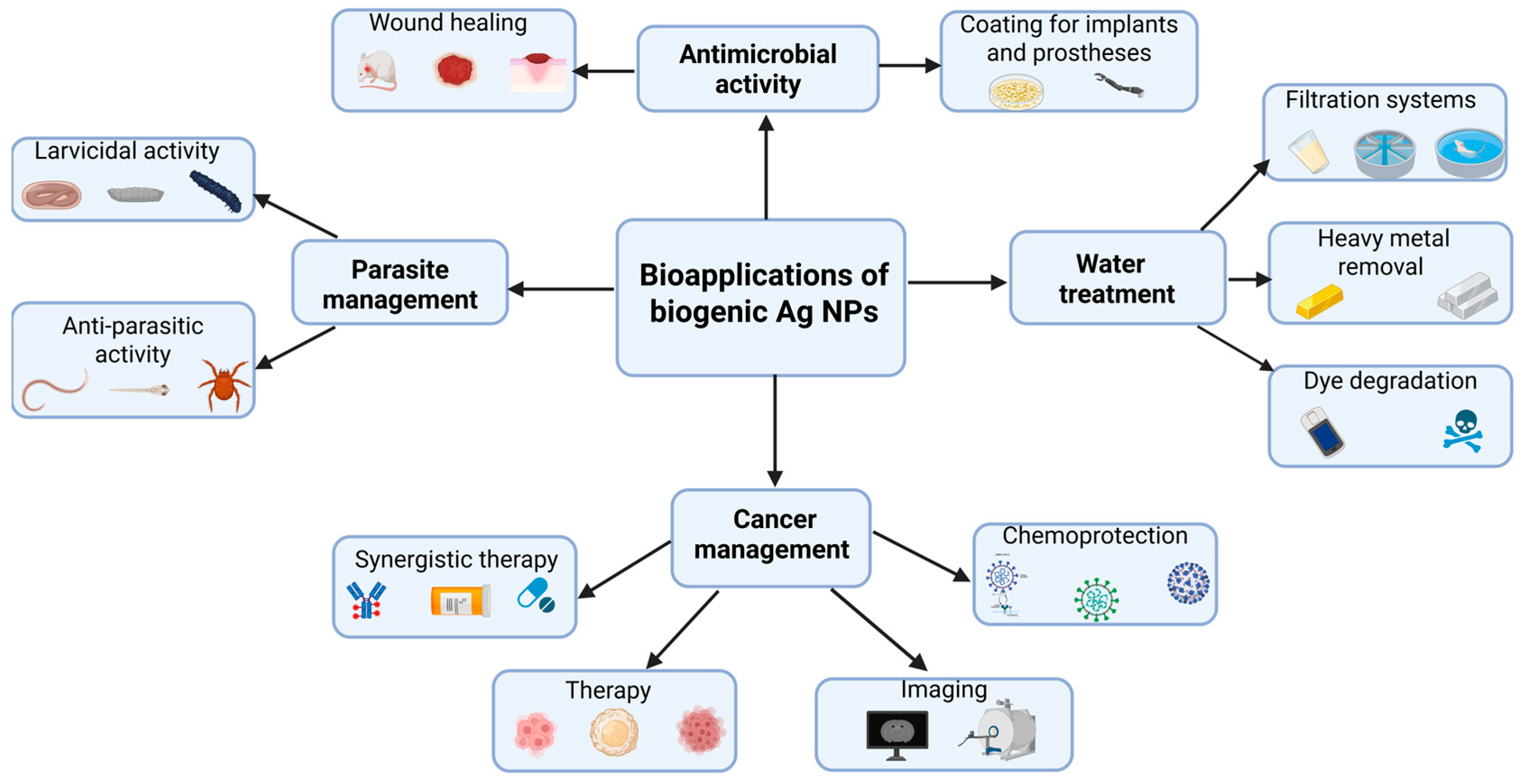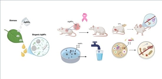 - Goel, M.; Sharma, A.; Sharma, B. Recent Advances in Biogenic Silver Nanoparticles for Their Biomedical Applications. Sustain. Chem. 2023, 4, 61–94. [Google Scholar] [CrossRef]