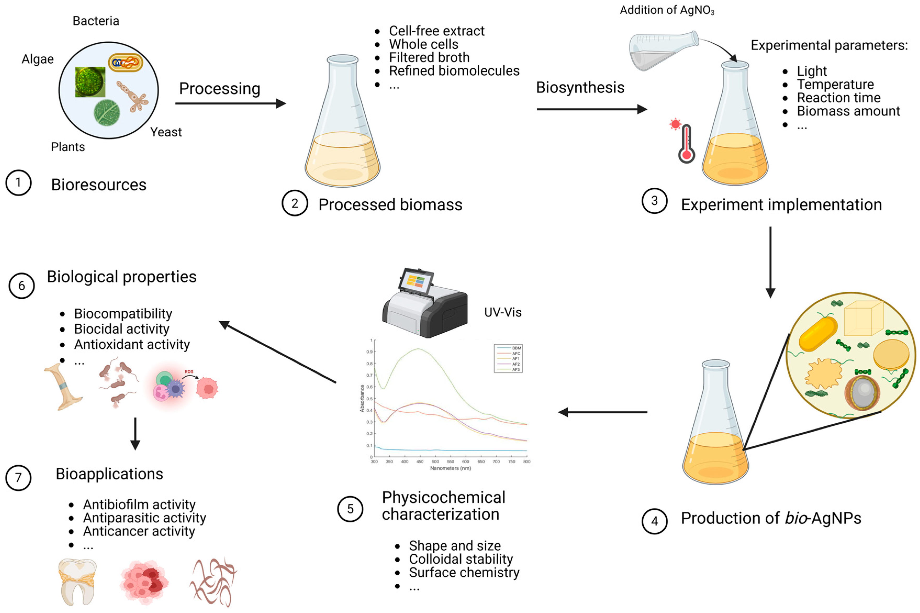 - Beltrán Pineda, M.E.; Lizarazo Forero, L.M.; Sierra, Y.C.A. Mycosynthesis of silver nanoparticles: A review. Biometals 2023, 36, 745–776. [Google Scholar] [CrossRef] [PubMed]