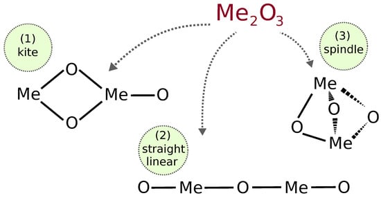 We started our studies by manually constructing geometries, maintaining stoichiometry, and imposing appropriate combinations of charges and spins. We build the following types of geometries, where iron or cobalt atoms alternate in connecting to oxygen atoms: kite-like, spindle-like, and linear configurations (see Figure 1). The spindle structure is the tightest and most compact; the kite structure can be formed from the spindle geometry by breaking one of the Me–O bonds, and the linear configuration can be generated by breaking an additional Me–O bond of the spindle.