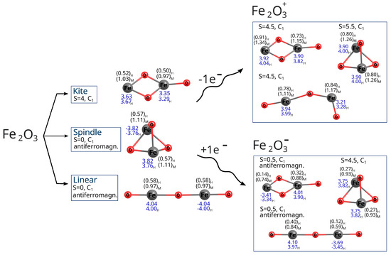 - Gutsev, G.; Bozhenko, K.; Gutsev, L.; Utenyshev, A.; Aldoshin, S. Dependence of Properties and Exchange Coupling Constants on the Charge in the Mn2O n and Fe2O n Series. J. Phys. Chem. A 2018, 122, 5644–5655. [Google Scholar] [CrossRef]