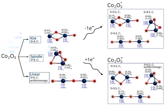 Molecular structures of UB3LYP/aug−cc−pVTZ that optimized the lowest energy states of cobalt trioxides and the corresponding cations and anions. Total spins (S) were shown for each optimized state. No symmetry was imposed on the geometry. The structures were optimized in a vacuum. Mulliken (M) and Hirshfeld (H) partial charges are shown in parentheses for the cobalt atom. Spin density values are shown in blue. If a given lowest-energy state among all those considered was characterized by an antiferromagnetic arrangement of spins, then this is marked in the drawing.