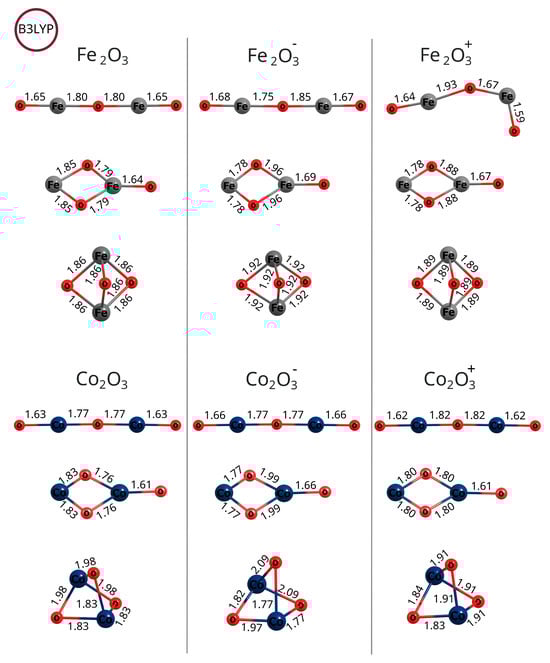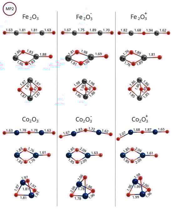 The linear (straight or bent) geometries of Fe2O3 and Co2O3 have not previously been proposed; some authors have even claimed only one possible state exists (structure and spin) for ferric oxide [,,,,]. However, the situation is likely more intricate, and no accurate, comprehensive depiction of the relationships between geometry, spin, and charge currently exists. Previous attempts were often based on simplistic assumptions, constructing only one type of structure, imposing limited spins, and unnecessarily applying symmetry restrictions, thus limiting hypothetical configurations. Clearly, the possible combinations of geometries, spins, and charges are numerous, and their complexity increases with particle size (Me2O3)n, where Me represents a metal atom and n an integer. It is crucial to identify the lowest-energy state (geometry and spin) to accurately determine physical properties and to study chemical reactions. And it is also important to compare antiferromagnetic and ferromagnetic states when so many spin combinations are possible in transition metal oxides. Thus, we considered more plausible spins for all configurations of neutral iron and cobalt trioxides and computed their energies (Figure 5 and Figure 6). At both the DFT level with the B3LYP functional and the MP2 method, we also considered antiferromagnetic electronic configurations for all iron(III) oxide and cobalt(III) oxide isomers, including their ionic variants (Figure 7, Figure 8, Figure 9 and Figure 10). We also maintained antiferromagnetic configurations following redox reactions. The optimized ionic geometries are summarized in Figure 2 and Figure 3.