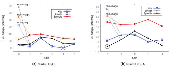 UB3LYP/aug−cc−pVTZ relative energies [kcal/mol] calculated with respect to the lowest-energy state of kite iron trioxide (S = 4) and linear cobalt trioxide (S = 0; antiferromagnetic conf.), respectively. The energies of both singlet states with non-magnetic (non-magn.) and antiferromagnetic configurations were taken into account. The lowest energy is marked with a circle.