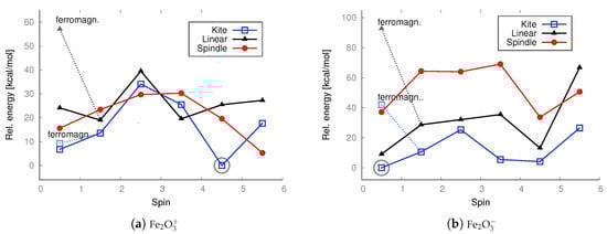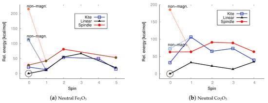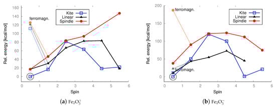 In the case of cations, the spindle configuration, as in the case of iron oxide isomers, is the least preferred because its energies are consistently the highest. In the case of cations, the higher the spin, the significantly higher the spindle energy, while both the high-spin linear and kite isomers, as well as the low-spin antiferromagnetic Isomers generally have lower energy (the system clearly prefers the high-open-shell configuration with low or high spin); see the charts in Figure 7 and Figure 9.