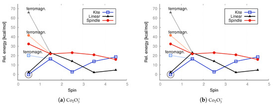 DFT UB3LYP/aug−cc−pVTZ relative energies [kcal/mol] calculated with respect to the lowest-energy doublet state (S = 1/2, including antiferromagnetic conf.) of the cation and anion of a kite cobalt trioxide, respectively. The energies of both doublet states—with ferromagnetic (ferromagn.) and antiferromagnetic configurations—were taken into account. The lowest energy is marked with a circle.