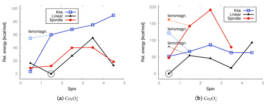 For the cobalt oxides, almost all spin states were also obtained, and the same can be said about cations and anions. Moreover, as shown by both the MP2 and DFT computations, the linear isomer is very stable. In the case of the kite and spindle isomers, their energies are about 20 kcal/mol higher than the energy of the lowest-energy linear isomer (antiferromagnetic singlet). In this case, the ferromagnetic high-spin configurations are also higher in energy than the antiferromagnetic singlet configuration.
