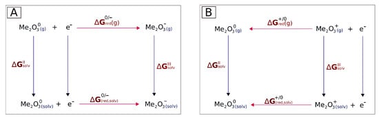 Li and co-workers developed a density functional theory protocol for calculating standard redox potentials of copper complexes, and they calculated the potentials in terms of the Gibbs free energy change of the redox reaction []. A similar approach was used for the calculation of reduction potentials for ferrocene, actinide, and other metal complexes [,,,,,]. Essentially, this method involves the Born–Haber cycle adapted for redox reactions, which in turn is an application of Hess’s Law. In this work, we adapted this protocol to calculate the standard reduction potentials for two types of reactions: (1) Me2O3 + e− → Me2 and (2) Me2 + e− → Me2O3, as depicted in Figure 12.