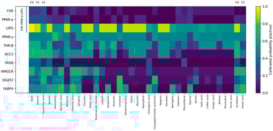 A key methodological result is the coupling of abstraction layers, from target-specific activity probabilities to system-level indices, and finally to technological feasibility. At the predictive level, the ensemble (Random Forest, XGBoost, CatBoost) with stochastic stacking, Murcko-/time-split partitioning, and leakage control produced robustly calibrated probabilities p(active): mean ROC-AUC = 0.834 (median = 0.840; range = 0.750–0.916) in cross-validation and 0.840 (median = 0.832; range = 0.758–0.956) on independent tests. The strongest results were achieved for FABP4 (0.956), THR-β (0.930), and HMGCR (0.882), while DGAT2 (0.758), FXR (0.765), and PPAR-γ (0.774) were more challenging. Model concordance was high (integral Kendall’s W = 0.829; mean pairwise Jaccard = 0.716), and calibration was confirmed by Brier scores (mean = 0.094; median = 0.088; range = 0.018–0.150) and near-perfect Hosmer–Lemeshow p-values (≥0.995). These properties are fundamental: they elevate probabilistic predictions from “surrogate” values to engineering-grade inputs—sufficient for accurate dose calculation and exposure-window design.