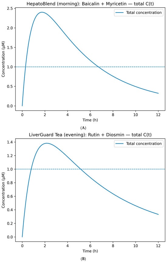 LiverGuard Tea (evening; Rutin + Diosmin). The evening formulation provides a smoother profile focused on PPAR-γ and enzymatic recovery pathways []. The combined Chep(t) curve shows Cmax ≈ 1.35–1.40 μM at tmax ~2 h, with concentrations maintained ≳1 μM up to ~6 h (Figure 2B). Owing to the slower absorption of glycosides, this profile is compatible with an aqueous (infusion) matrix, and %T>IC50 across evening-window targets is achieved at moderate peak levels.