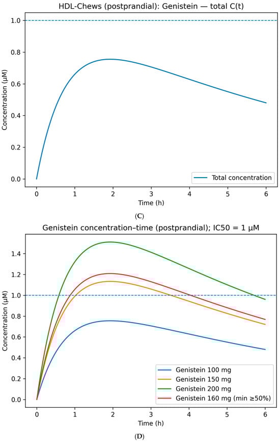 HDL-Chews (postprandial; Genistein). For the postprandial window, dosing was minimized while maintaining %T>IC50 ≥ 50% over the 0–6 h interval []. For the postprandial window, dosing was minimized while maintaining %T>IC50 ≥ 50% over the 0–6 h interval []. The baseline 100 mg simulation served as a reference for optimization; corresponding values are described in the PBPK modeling section of Materials and Methods and explicitly labeled as “Baseline (100 mg)” vs. “Optimized regimen” to avoid ambiguity. Dose–response curves (Figure 2D) show that 100 mg is insufficient (Cmax ~0.75 μM), whereas 150–200 mg achieves concentrations ≥1 μM. The minimally sufficient dose is ≈160 mg (Cmax ~1.2 μM). The final monotherapy profile is shown in Figure 2C, with %T>IC50 calculated by per-target effect aggregation, primarily addressing LIPG/FABP4 during the postprandial period.