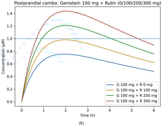 Exposure-enhanced variant (postprandial combination). To reduce the genistein dose, combinations of Genistein 100 mg + Rutin 100/200/300 mg were simulated (Figure 2E). Rutin does not contribute concentration “additively” for the same target but increases systemic probability through complementary and partially overlapping profiles (aggregated using HSA/Bliss independence). At 200–300 mg rutin, systemic coverage comparable to the 160–200 mg genistein monotherapy is achieved, but with a reduced genistein dose—technologically advantageous for chewable formulations (rapid release ≤ 5 min; reduced bitterness and portion mass). Where necessary, absorption can be enhanced via phytosomal complexes (for quercetin, relative bioavailability increases up to ~5.2× have been reported) without altering the underlying coverage logic [].