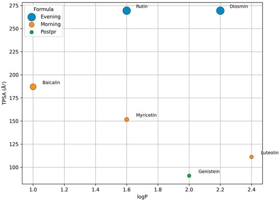Physicochemical diversity of key actives. Scatter plot of logP vs. TPSA (point size ∝ MW) for Baicalin, Myricetin, Luteolin (Morning), Rutin, Diosmin (Evening), and Genistein (Postprandial). Points are colored by target formulation; lead compounds are annotated.