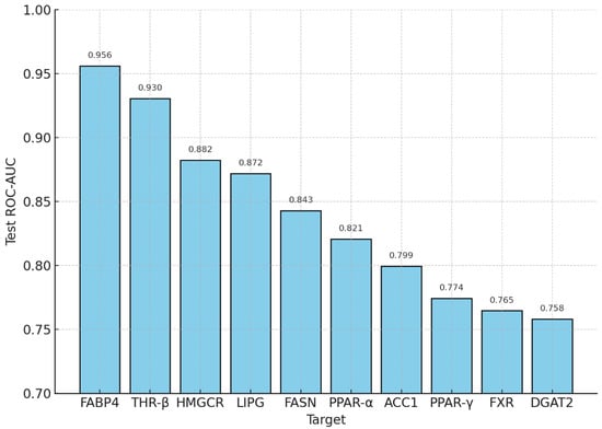 The constructed ensemble—comprising Random Forest, XGBoost, and CatBoost as base learners, with second-level logistic meta-regression and isotonic calibration—achieved robust class separation across all ten MASLD targets in a fully in silico setting. Under Murcko- and time-split cross-validation, the mean ROC-AUC was 0.834 (median = 0.840; range = 0.750–0.916). On independent test sets, the mean test ROC-AUC was 0.840 (median = 0.832; range = 0.758–0.956). The strongest performance was observed for CHEMBL2083 (FABP4, 0.956), CHEMBL1947 (0.930), and CHEMBL3247 (HMGCR, 0.882), while the weakest results were obtained for DGAT2 (0.758), FXR (0.765), and PPAR-γ (0.774).