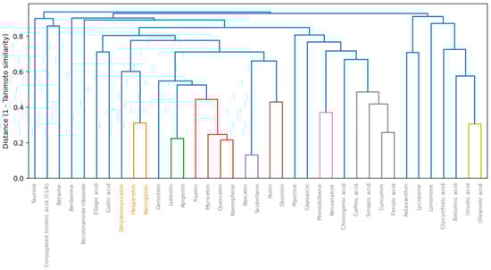 Structural stratification of the prioritized pool was performed using Morgan fingerprints (ECFP4, radius = 2; 2048 bits) with the Tanimoto similarity metric. The clustering cut-off was determined in auto_cut mode across a candidate grid of 0.10–0.40, selecting the threshold that maximized the silhouette score; in the present run, thr = 0.20 was chosen. The resulting topology at the structural level comprised six clusters with size distribution [32, 1, 1, 1, 1, 1], i.e., one dominant “core” and five singletons. This partitioning reflects that, under a relatively permissive threshold (0.20), chemically diverse polyphenolic and terpenoid motifs were drawn into the central core, while rare scaffolds remained as isolated nodes.