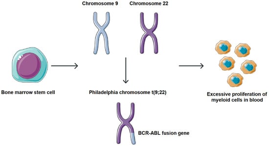 Molecular pathogenesis of CML. Formation of the BCR-ABL fusion gene. This cytogenetic aberration fuses the 5′ segment of the BCR gene on chromosome 22 with the 3′ segment of the ABL gene on chromosome 9, resulting in the formation of the BCR-ABL fusion gene. Parts of the image were provided by Servier Medical Art (https://smart.servier.com/), licensed under CC BY 4.0 (https://creativecommons.org/licenses/by/4.0/, accessed on 29 September 2025).