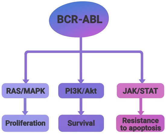 Chronic myeloid leukemia (CML) is a myeloproliferative neoplasm arising from hematopoietic stem cells and characterized by excessive proliferation of myeloid lineage cells in bone marrow and peripheral blood. It accounts for approximately 15–20% of adult leukemias and has an annual incidence of ~0.8–1.5 per 100,000 globally, with a slight incidence preference in men. Clinically, most patients present in a chronic phase, which may progress, if untreated, to an accelerated phase and eventually a blast crisis [,]. CML is marked by the presence of the Philadelphia (Ph) chromosome, a product of reciprocal translocation t (9;22). This cytogenetic aberration fuses the 5′ segment of the BCR gene on chromosome 22 with the 3′ segment of the ABL gene on chromosome 9, resulting in the formation of the BCR-ABL fusion gene. The translated BCR-ABL oncoprotein exhibits constitutive tyrosine kinase activity, which activates multiple signaling cascades involved in cell proliferation, survival, and genomic instability, driving the leukemogenic process in CML (Figure 1) [,].