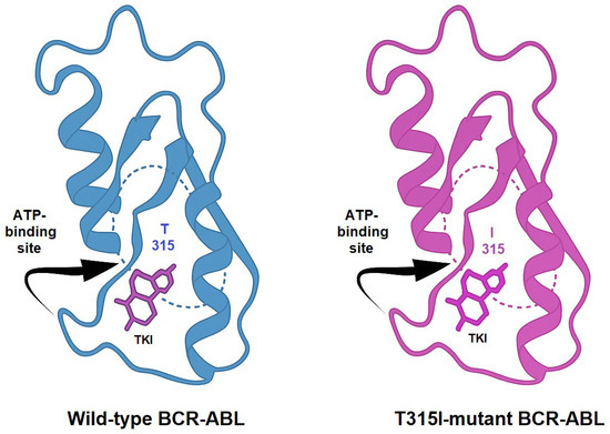 TKIs exert their therapeutic effect by competitively binding to the ATP-binding site of BCR-ABL, thereby blocking its kinase activity. Imatinib, the first clinically approved TKI, revolutionized the treatment landscape of CML. However, the emergence of resistance mechanisms, such as kinase domain mutations, like the T315I, BCR-ABL overexpression, and activation of bypass pathways, necessitated the development of next-generation inhibitors. Structural comparison between the wild-type and T315I-mutant forms of BCR-ABL reveals key alterations in the ATP-binding site. The threonine-to-isoleucine substitution at position 315 disrupts hydrogen bonding with many TKIs and introduces steric hindrance, explaining resistance to earlier inhibitors (Figure 3) [,].