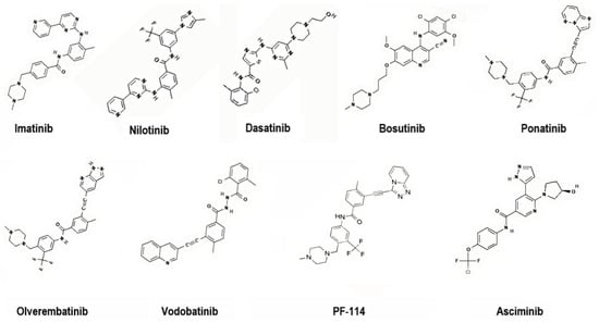 To address these challenges, second-generation TKIs (nilotinib, dasatinib, bosutinib), third-generation TKIs (ponatinib, olverembatinib, vodobatinib), and, more recently, fourth-generation TKIs (PF-114) and inhibitors that specifically target the ABL Myristoyl Pocket (STAMP) (asciminib) have been introduced (Figure 4). These agents demonstrate enhanced potency, broader mutation coverage, and improved pharmacologic profiles, though long-term use remains limited by toxicity and cost [,].