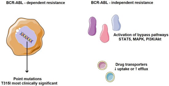 Cancer cells can evade chemotherapy through various mechanisms involving altered regulation of the cell cycle, apoptosis, and cell adhesion. Resistance to TKIs, whether primary or acquired, is one of the major challenges in cancer treatment. The main resistance mechanisms are classified into two categories, BCR-ABL-dependent and BCR-ABL-independent (Figure 5). BCR-ABL-dependent resistance is mainly influenced by the site of mutations in BCR-ABL and its uncontrolled gene expression. One of the most common resistance mechanisms is a mutation in the ABL kinase domain, which directly or indirectly prevents TKI binding, either by altering BCR-ABL conformation, reducing its affinity for the inhibitor, or by obstructing the binding site. Point mutations in the ABL kinase domain are observed in over 50% of CML patients who develop resistance, especially in those with acquired resistance rather than primary. Such mutations are associated with a higher risk of developing additional genetic abnormalities, leading to a worse prognosis and faster disease progression [,,].