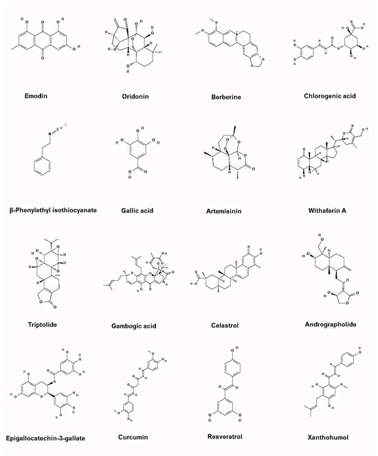 Representative chemical structures of the plant-based inhibitors of BCR-ABL. 2D structure images were obtained from PubChem (PubChem Identifier CID for emodin 3220; oridonin 5321010; berberine 2353; chlorogenic acid 1794427; β-Phenylethyl isothiocyanate 16741; gallic acid 370; artemisinin 68827; withaferin A 265237; triptolide 107985; gambogic acid 9852185; celastrol 122724; andrographolide 5318517; epigallocatechin-3-gallate 65064; curcumin 969516; resveratrol 445154; xanthohumol 639665).
