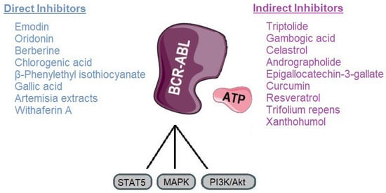CML has been revolutionized by TKIs, yet resistance, particularly due to mutations like T315I, continues to limit therapeutic success. In this context, natural compounds represent a promising adjunctive approach, either by directly targeting BCR-ABL or by modulating signaling pathways that contribute to leukemic cell survival. Our review highlights a range of phytochemicals with potential inhibitory activity against BCR-ABL, grouped as direct or indirect modulators (Figure 7).