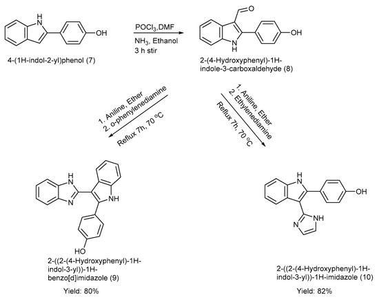 El-Nakkady et al. [39] synthesized two indole–imidazole derivatives (9–10) using ring construction methods incorporating the Vilsmeier–Haack reaction with yields of product (9) at 80% and product (10) at 82% [39]. The 2-phenyl indole moiety was formylated at C-3, and the formyl group was replaced with several other substituents, including imidazole and benzimidazole, respectively [39]. The synthesis process, along with the reagents and reaction conditions, is depicted in Scheme 2 [39].