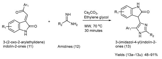 The starting material (11) had multisite reactivity and amidines (12), were also variously substituted. Thus, it resulted in polyfunctionalized 3-(Imidazole-4-yl) Indolin-2-ones, making it attractive for generating compound libraries in drug discovery. The method used mild conditions, with Cs2CO3 in ethylene glycol under microwave irradiation, offering notable speed and simplicity. However, the study did not report any biological evaluation, leaving the pharmacological relevance of the products unknown. Furthermore, the scalability in terms of the microwave conditions and solvent choice may restrict direct industrial applications [27].