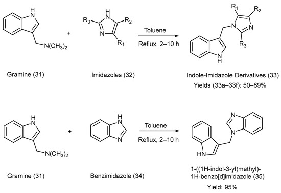 Jasiewicz et al. [19] synthesized C-3-substituted indole derivatives from gramine [3-(dimethyl amino methyl) indole], an alkaloid present in barley (Hordeum vulgare), via a nucleophilic substitution reaction. Gramine with a good leaving group was used as a substrate, and various alkyl-substituted imidazole moieties were heated at reflux in the presence of toluene [19]. The reactions utilized for the synthesis, reaction reagents, and reaction parameters are illustrated in Scheme 8. Various substituents attached to precursors (32) and the products (33), as well as the yields of products (33) and (35), are presented in Table 11 [19].