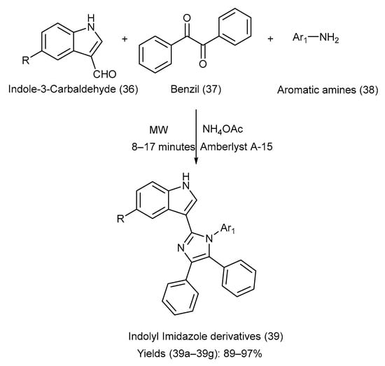 Nirwan et al. [52] synthesized eight different indole–imidazole derivatives via condensation of indole-3-carbaldehyde, various substituted aromatic amines, and ammonium acetate in the presence of the Amberlyst A-15 catalyst via irradiation with microwaves under solvent-free conditions [24,25,52]. The synthetic pathway with reaction conditions is depicted in Scheme 9. Table 14 presents the different groups attached to the starting materials (36) and (38), the indole–imidazole derivative (39), and the comparison of their yields [24,25,52].