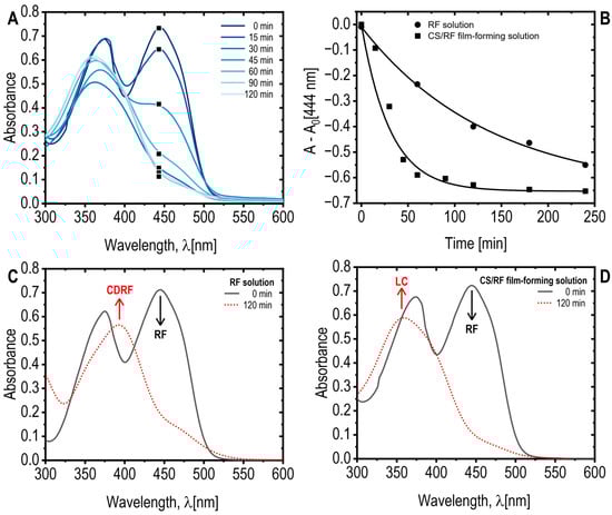 Figure 1A presents the spectral changes in the CS/RF solution, where RF absorption bands at 370 nm and 444 nm were observed [36,37]. Upon blue LED exposure, the absorbance at 444 nm decreased by 50% within 40 min, reaching a maximum reduction at 60 min of light exposure (0.46 J cm−2 of energy dose) (Figure 1B). Prolonged irradiation shifted the UV absorption at 370 nm to 354 nm, with an isosbestic point at 402 nm (Figure 1A), suggesting structural modification of RF while maintaining reaction stoichiometry [38]. In the absence of chitosan, RF degradation led to the formation of a new band at 410 nm (Figure 1C), indicative of a photoproduct identified as CDRF [27,36]. Conversely, in the CS/RF solution, a new band at 356 nm (Figure 1D) signified the formation of lumichrome (LC), as previously reported [36,39]. These findings highlight the influence of chitosan on RF photodegradation pathways and photoproduct formation. In the CS/RF film-forming solution, our results indicate that RF predominantly undergoes photodegradation to form LC, suggesting that the photoreduction pathway is favored over the photoaddition pathway (i.e., that forms CDRF) [27].