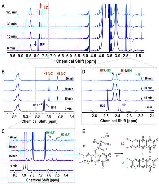 To investigate the structural modifications of riboflavin (RF) within the film-forming solution, the CS/RF system was analyzed using 1H NMR spectroscopy. All samples were prepared under the same conditions used for film preparation (Section 3.4.2). Control samples of RF and CS/RF film-forming solutions, maintained in the dark (0 min), showed no differences in RF signals, confirming that all observed reactions were induced by light exposure).