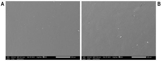 The SEM micrographs of the CS and CS/RF films are presented in Figure 3. These images provide insight into the surface morphology of the chitosan-based films and the effect of RF incorporation on the polymer matrix structure. The CS film (Figure 3A) exhibits a homogeneous and smooth surface with no evident porosity. This morphology is characteristic of chitosan, which typically forms compact and continuous films due to strong intermolecular interactions and a uniform polymer chain arrangement. Upon the addition of RF (Figure 3B), the surface remains uniform, with no apparent aggregates or discontinuities. The similar morphological features observed in the CS/RF film suggest good dispersion of RF within the polymer network, indicating compatibility between the components.