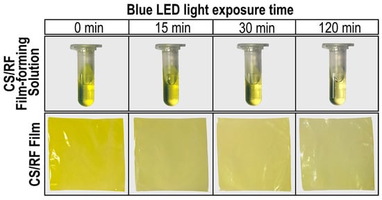 Photographs of CS/RF film-forming solutions and CS/RF films exposed to blue LED light for different durations.