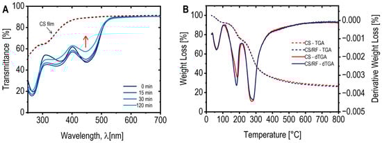 (A) UV/Vis transmittance spectra of the CS film (dotted lines) before and after 120 min of blue LED light exposure (note both lines are overlapping), and CS/RF films (solid lines) exposed to blue LED light for various durations; (B) TGA curves (dotted lines) and derivative thermogravimetric profiles (dTGA) (solid lines) of the CS film and CS/RF film before light exposure.