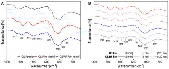ATR-FTIR spectra and zoomed-in fingerprint region for CS powder, CS and CS/RF films (A) before irradiation (0 min); and (B) at different irradiation times (0, 15 or 120 min).